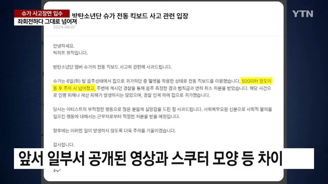 슈가는 음주 상태에서 전동 스쿠터를 운전했습니다. 당시 혈중알코올농도는 0.227%로, 면허 취소 기준의 약 세 배에 달했다고 해요.