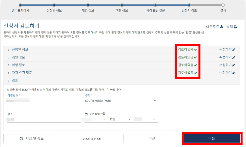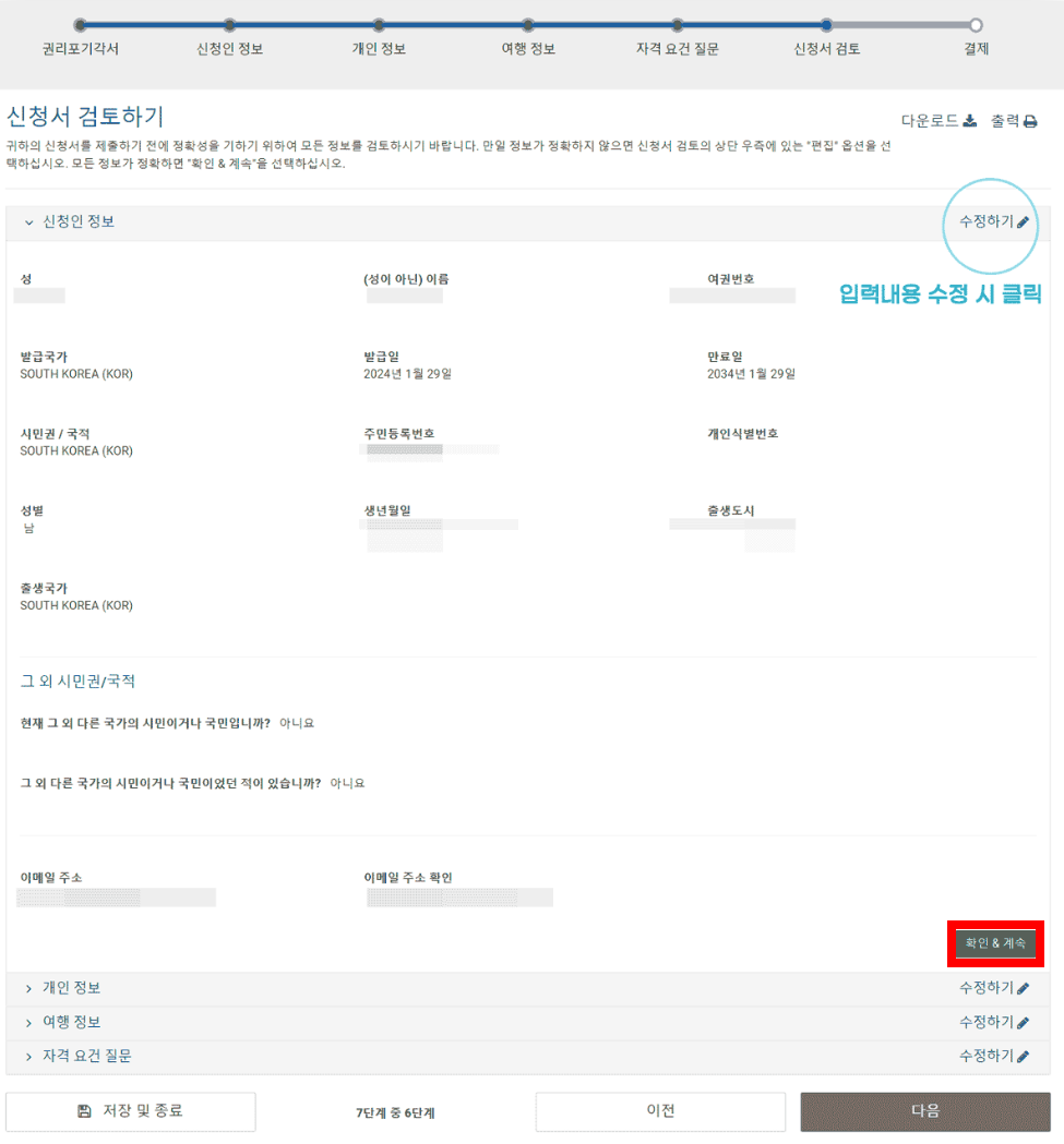 - 신청서 검토하기 (확인&계속 버튼 눌러 신청정보 검토하기)