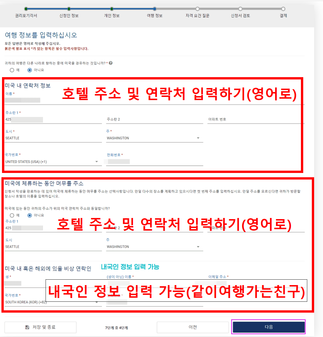 ✅ 호텔 주소 또는 예약한 숙소 정보를 입력하면 충분합니다. 괌이나 하와이처럼 관광객이 많은 지역은 호텔 정보로 대체 가능합니다.