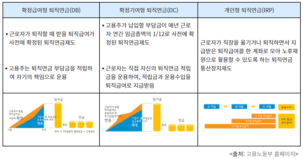 퇴직연금에는 크게 DB형과 DC형, 그리고 IRP 제도가 있습니다.